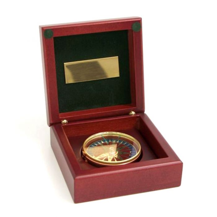 4" Brass Brinton Compass In Wood Case (Brass Anchor & Corners)